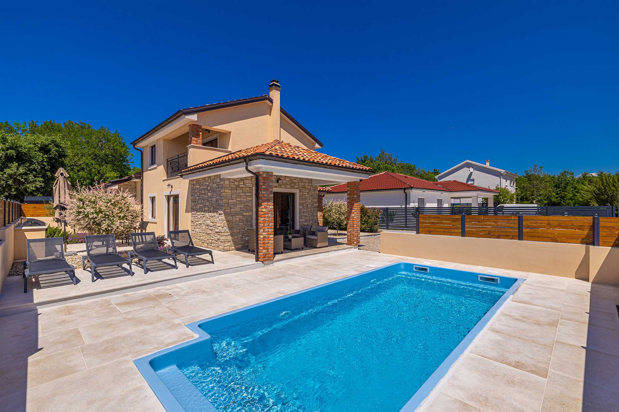 Prekrasna kuća za odmor DIVNA u Pinezićima može primiti 6 osoba. U prizemlju kuće nalazi se dnevni boravak, kuhinja s izlazom na terasu, spavaća soba s bračnim krevetom i kupaonica. Na prvom katu nalaze se dvije spavaće sobe s bračnim krevetima i kupaonica. Prostor koji se iznajmljuje je privatan i namijenjen isključivo gostima. Gostima je na raspolaganju privatni vanjski prostor s bazenom, terasom i roštiljem. Vlasnici žive na imanju, u zasebnom stanu sa zasebnim ulazom i koriste samo jedno parkirno mjesto.